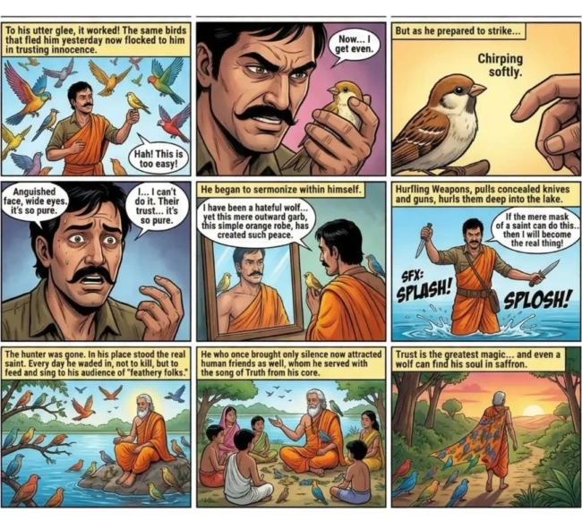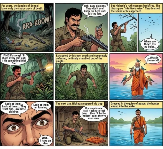 The Hunter Who Became a Saint. Once feared across the forests of Bengal, Nishada was a ruthless hunter-until one moment of disguise changed his destiny forever. What began as a trick to deceive innocent birds turned into a transformation of the heart. Surrounded by trust, he discovered something he had never known before… compassion. Sometimes, pretending to be good is the first step toward becoming good.