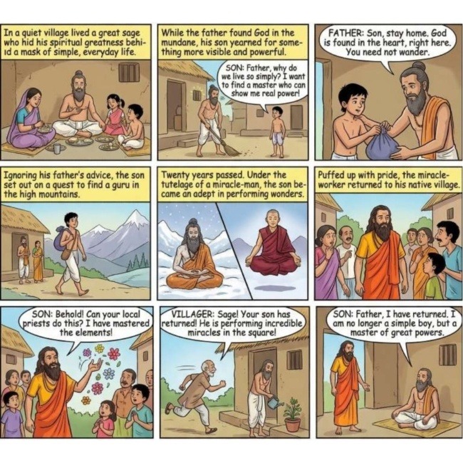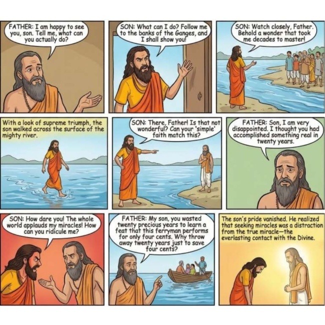 The Miracle Man - True power does not lie in miracles that impress the world, but in humility, wisdom, and God-realization. What takes years of prideful effort may be achieved in a moment through simplicity and surrender. The greatest miracle is not walking on water but awakening to the Source of all power within.